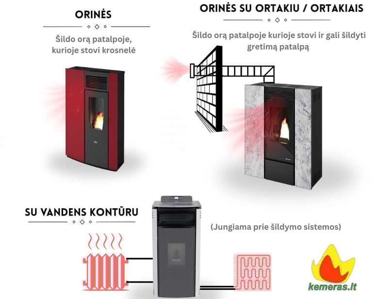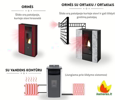 Orinis šildymas: Išskirta šiluma yra naudojama orui šildyti. Krosnelėje esantys ventiliatoriai paskirsto šiltą orą iš degimo kameros į kambarius, todėl tai efektyvus būdas greitai šildyti patalpas. Kai kurie modeliai gali turėti ir pūstuvus, kurie padeda efektyviau išsklaidyti šilumą.